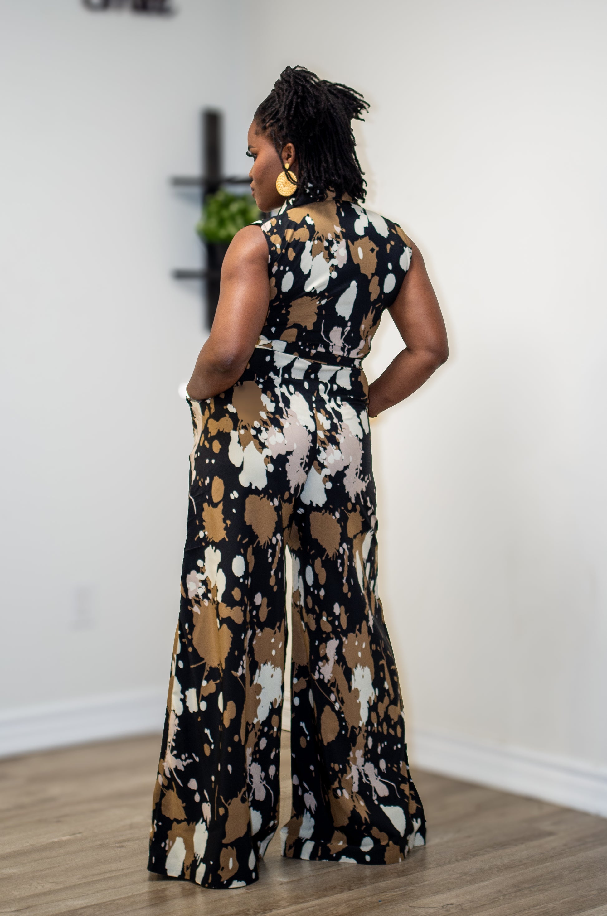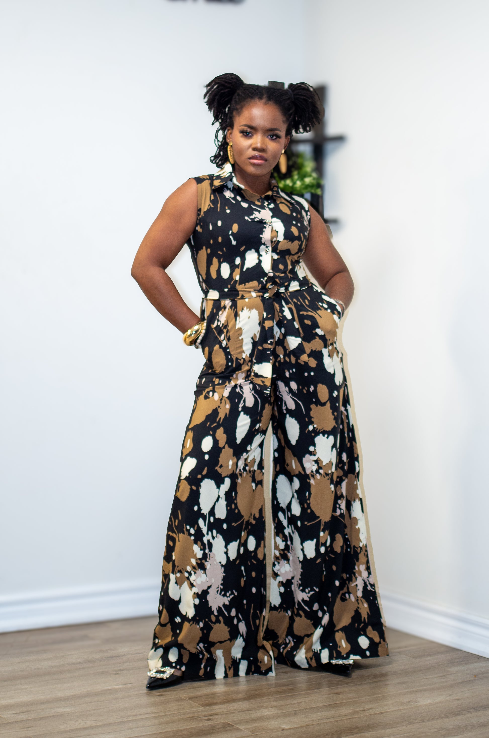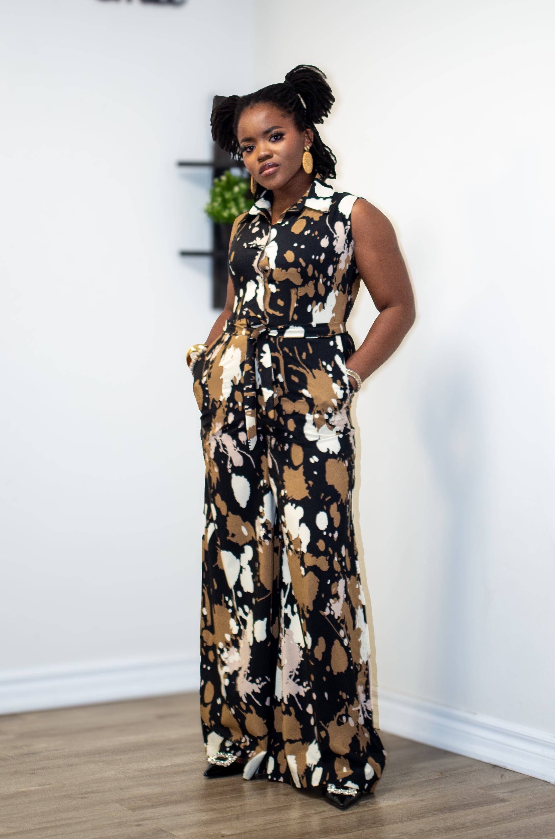 Bold and effortless, the Aeris Jumpsuit features a sleeveless design with a collared, button-front top and a belted waist for a defined silhouette. Crafted from crêpe fabric with a subtle stretch, it flows into wide-leg pants with side pockets — balancing sharp tailoring with everyday ease. Perfect for vacations, brunches, or chic evenings out.
