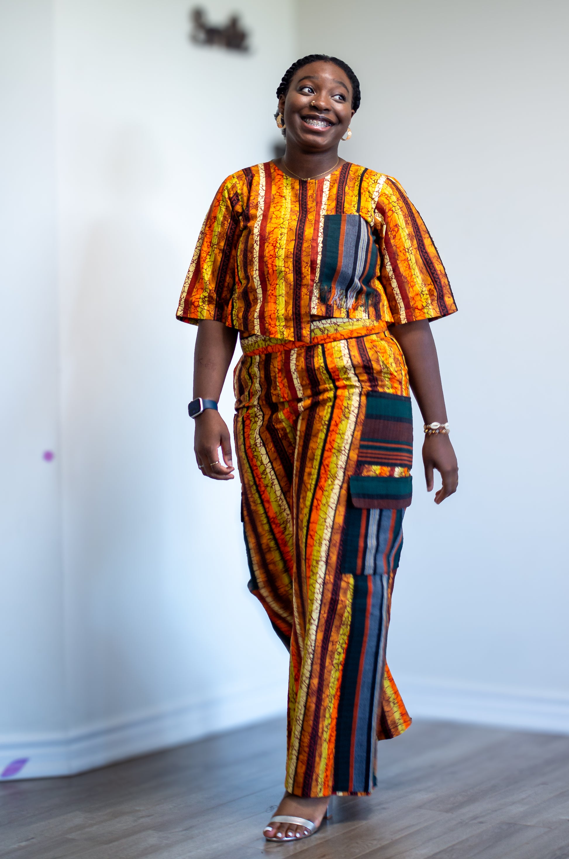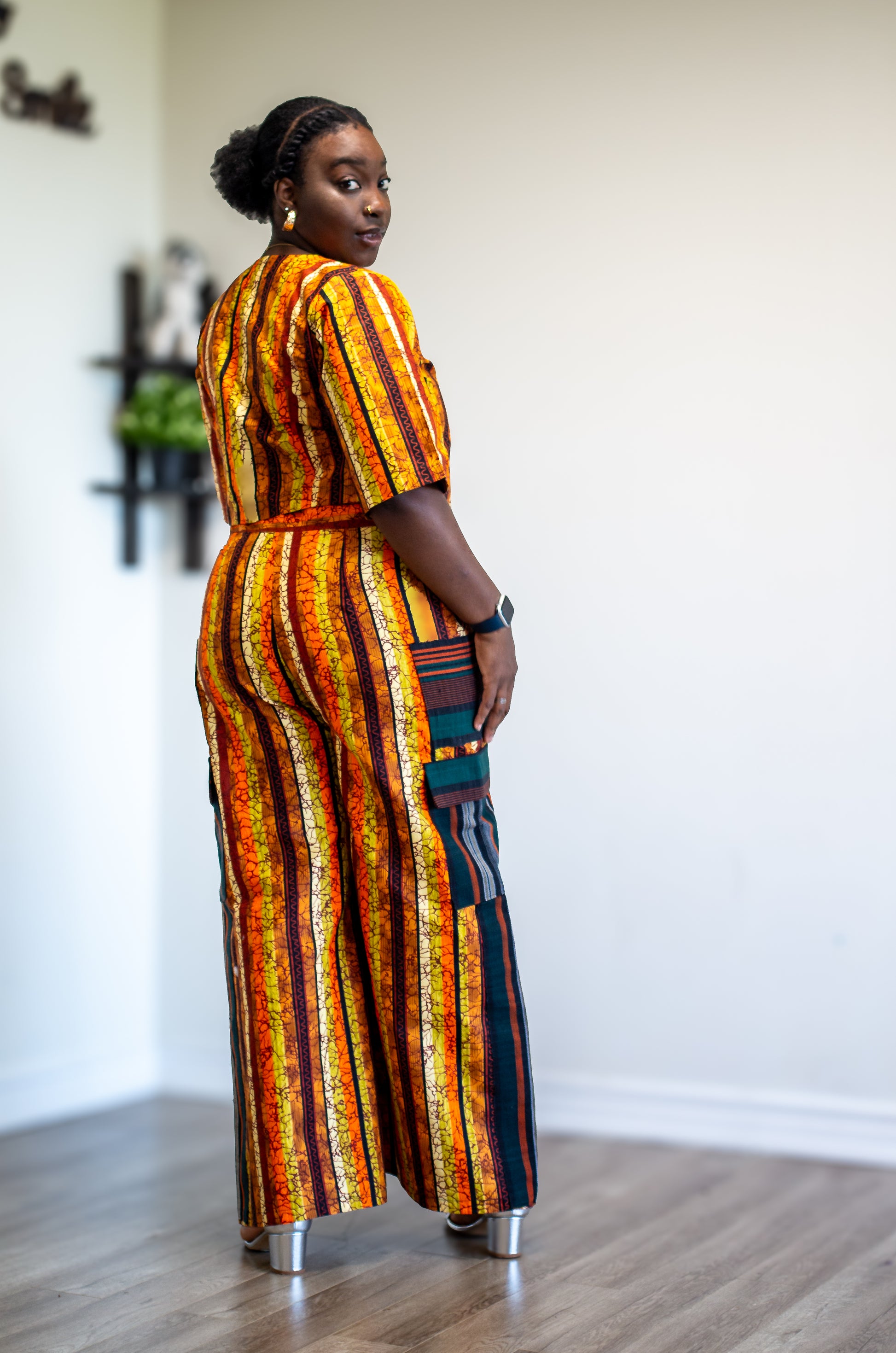 - Aso-oke panel on pants with functional side pockets