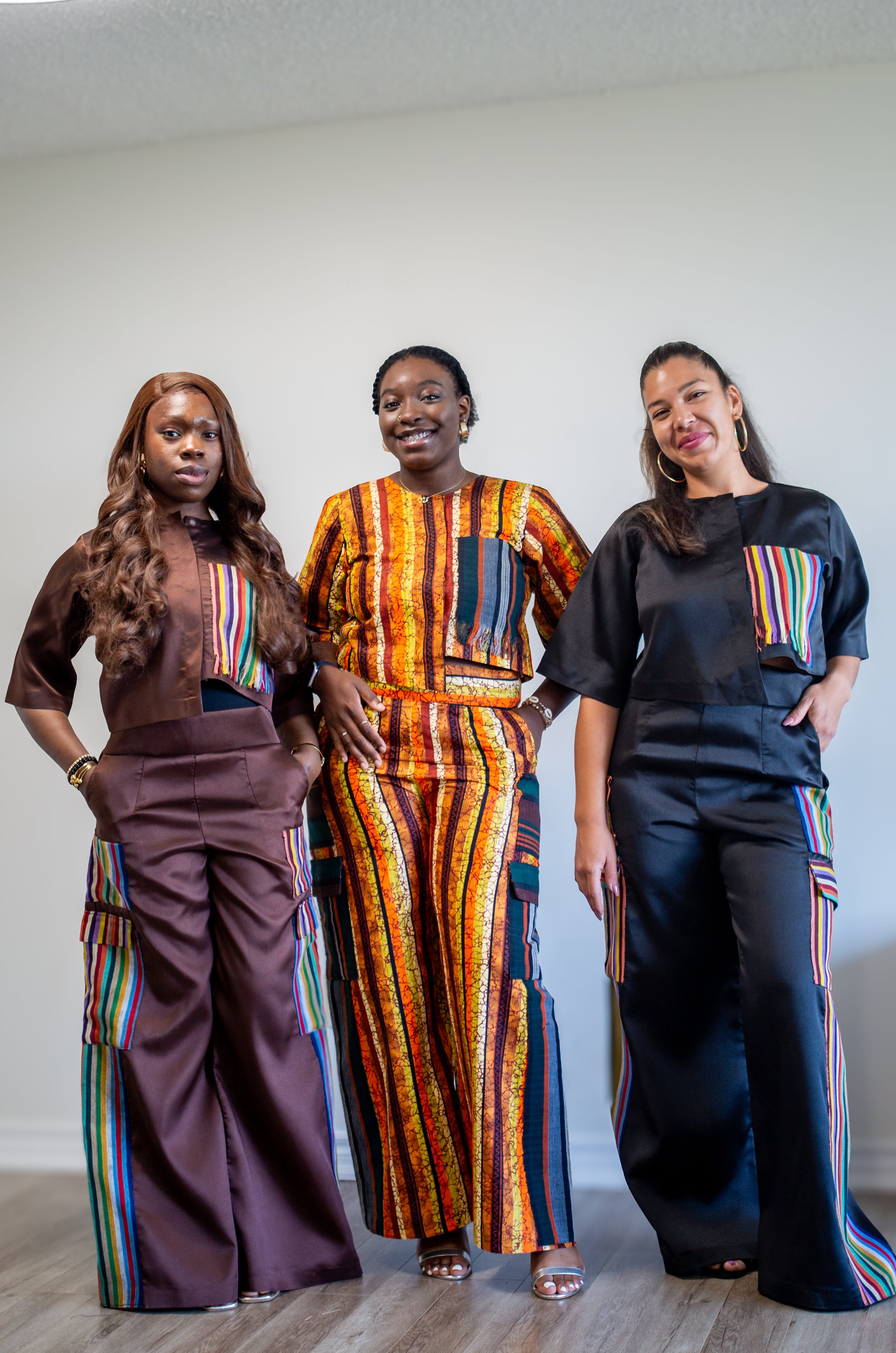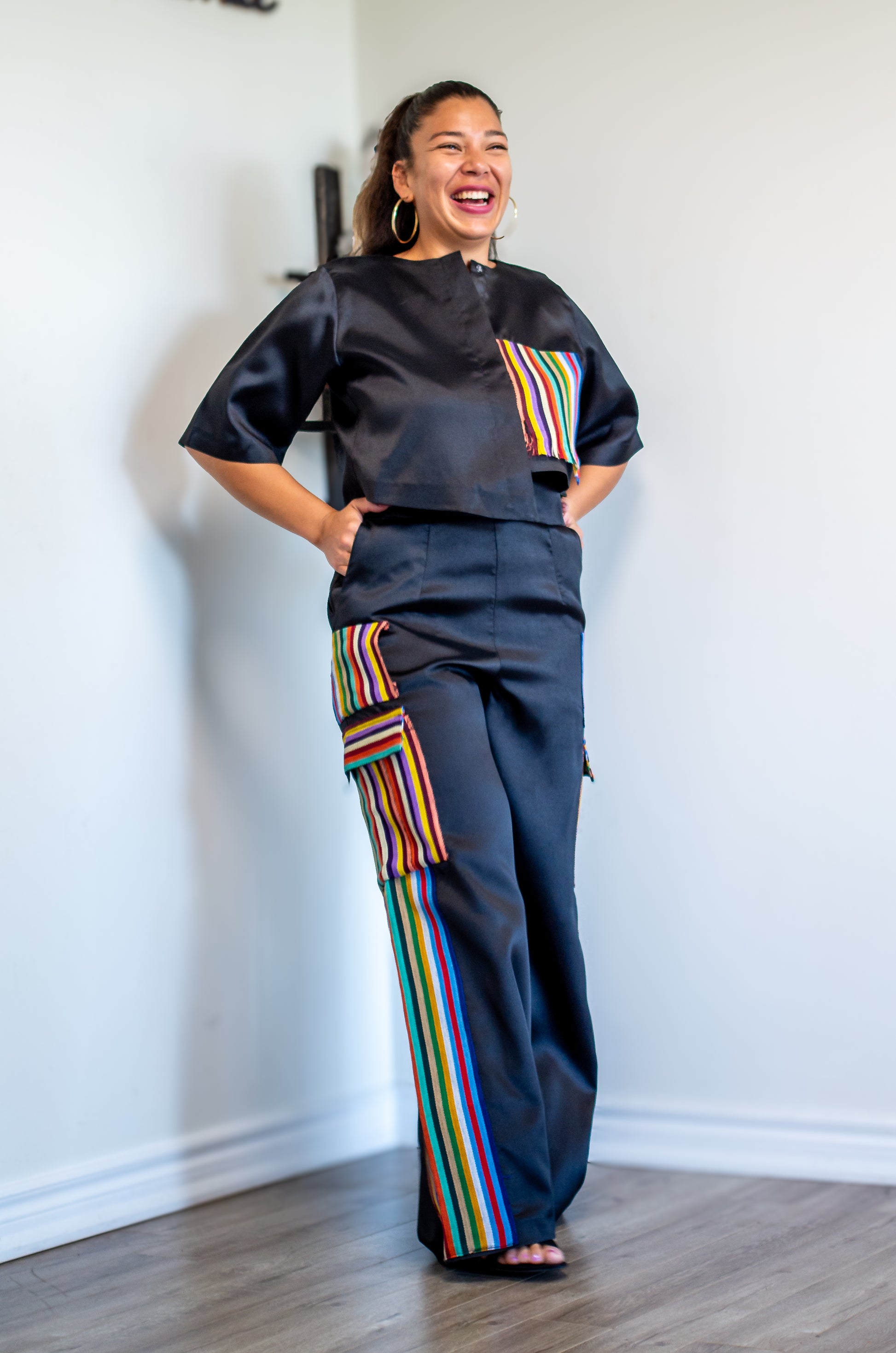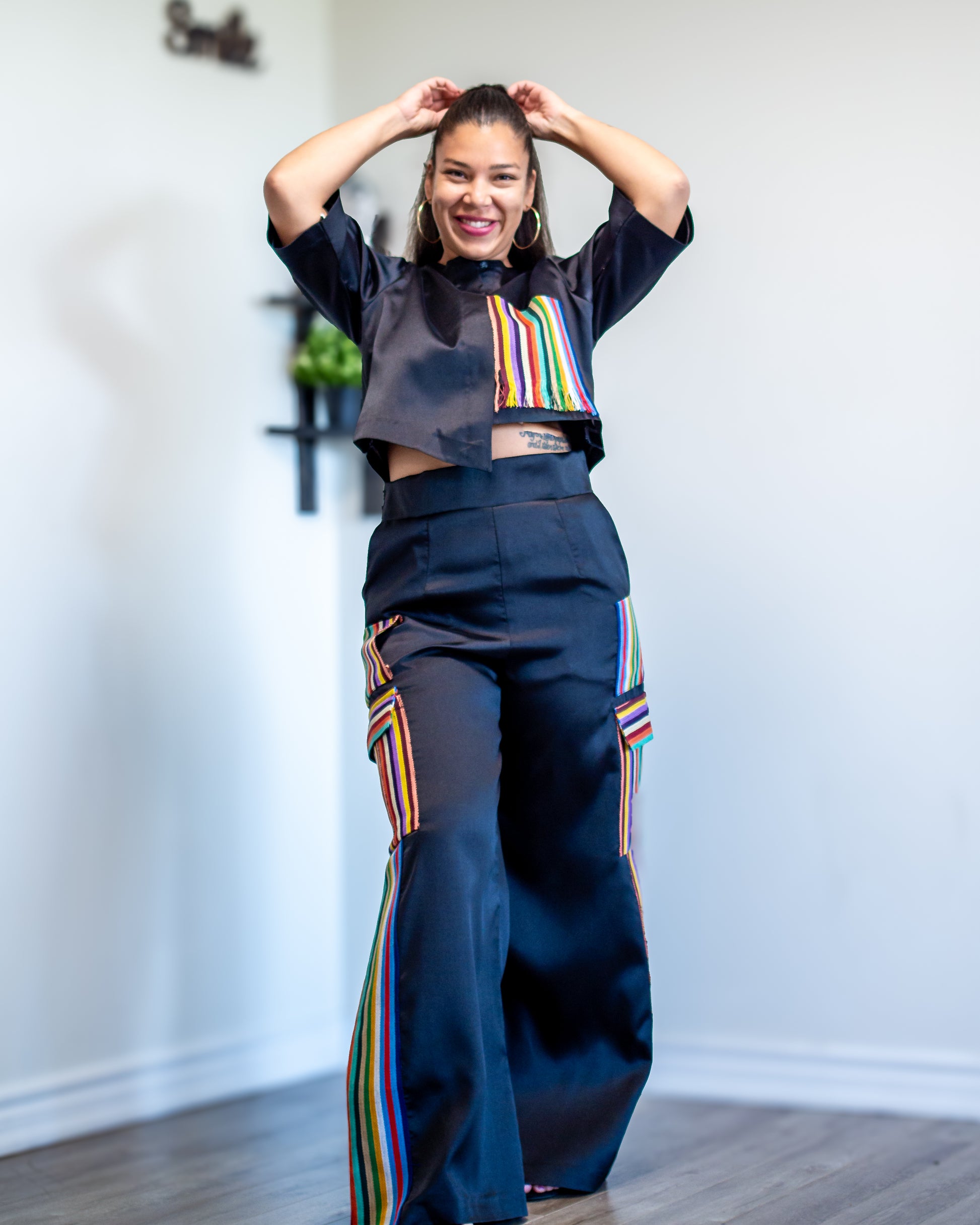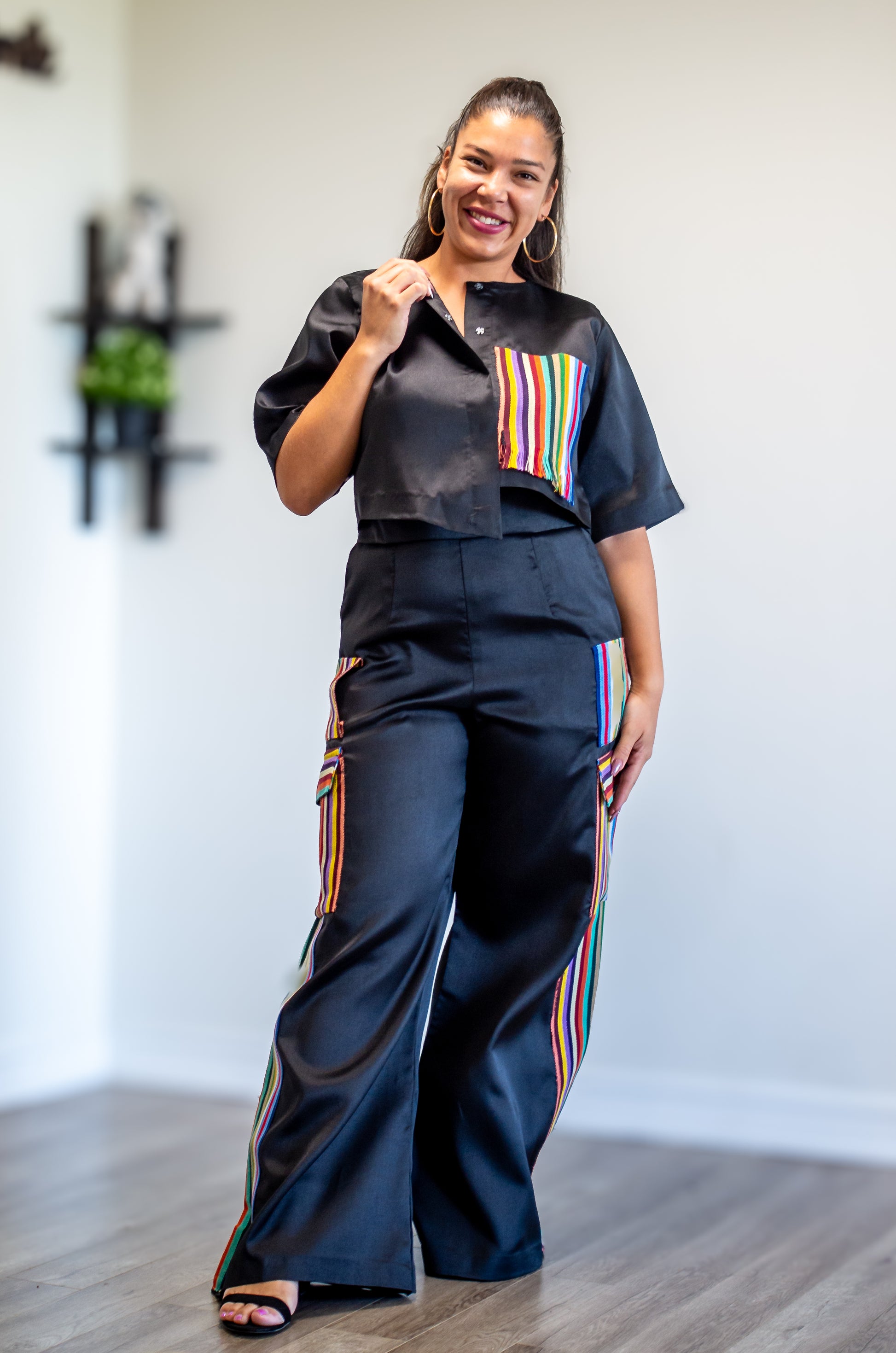 Bring the vibe with this two-piece set that knows how to stand out. The cropped asymmetrical shirt keeps it fun and fresh, while the wide-leg high-waist pants with Aso-oke detailing bring all the drama. With side pockets for practicality and a silhouette made to flatter, it’s a set that goes from casual cool to occasion-ready without missing a beat.