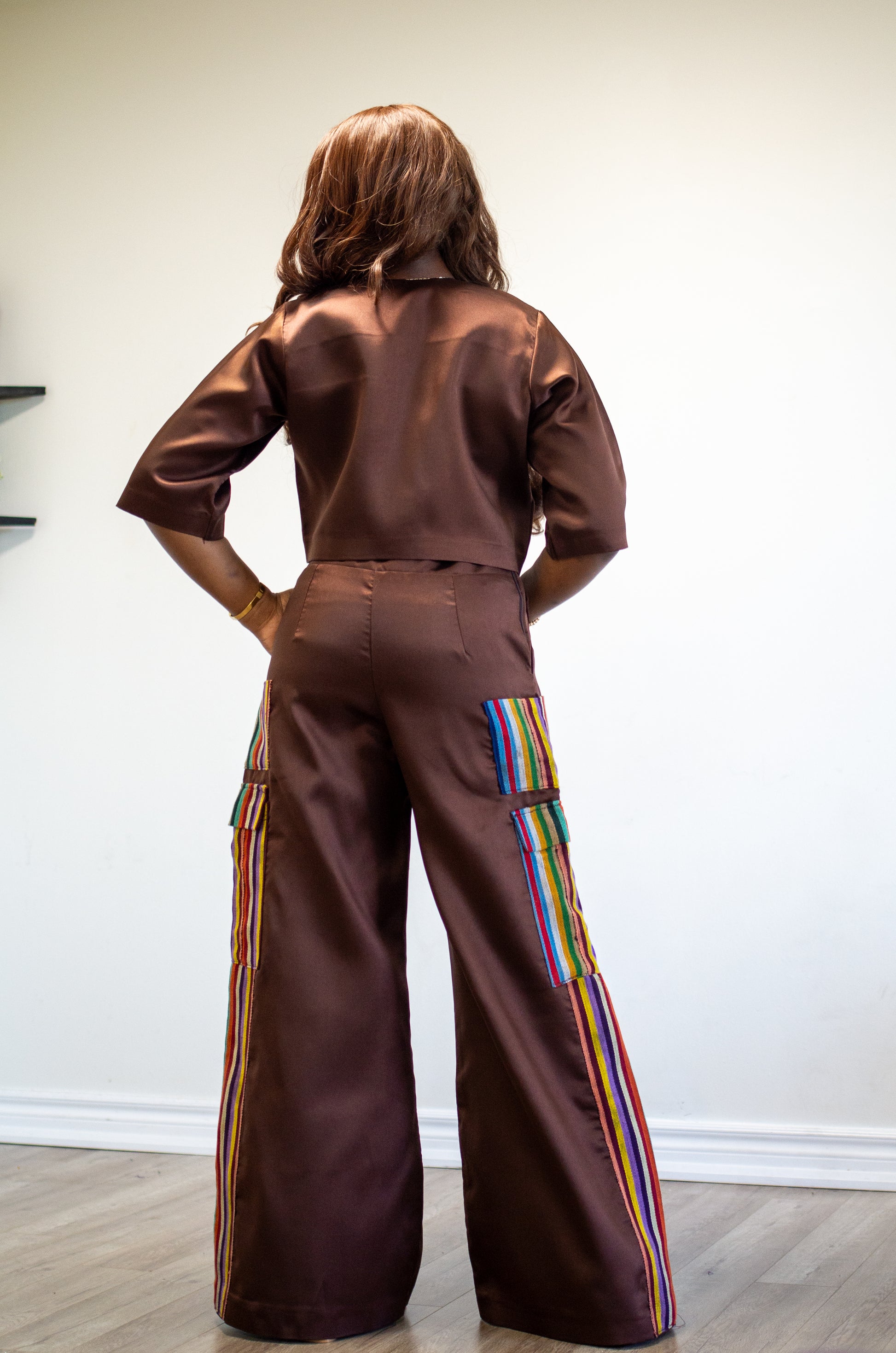 Bring the vibe with this two-piece set that knows how to stand out. The cropped asymmetrical shirt keeps it fun and fresh, while the wide-leg high-waist pants with Aso-oke detailing bring all the drama. With side pockets for practicality and a silhouette made to flatter, it’s a set that goes from casual cool to occasion-ready without missing a beat.