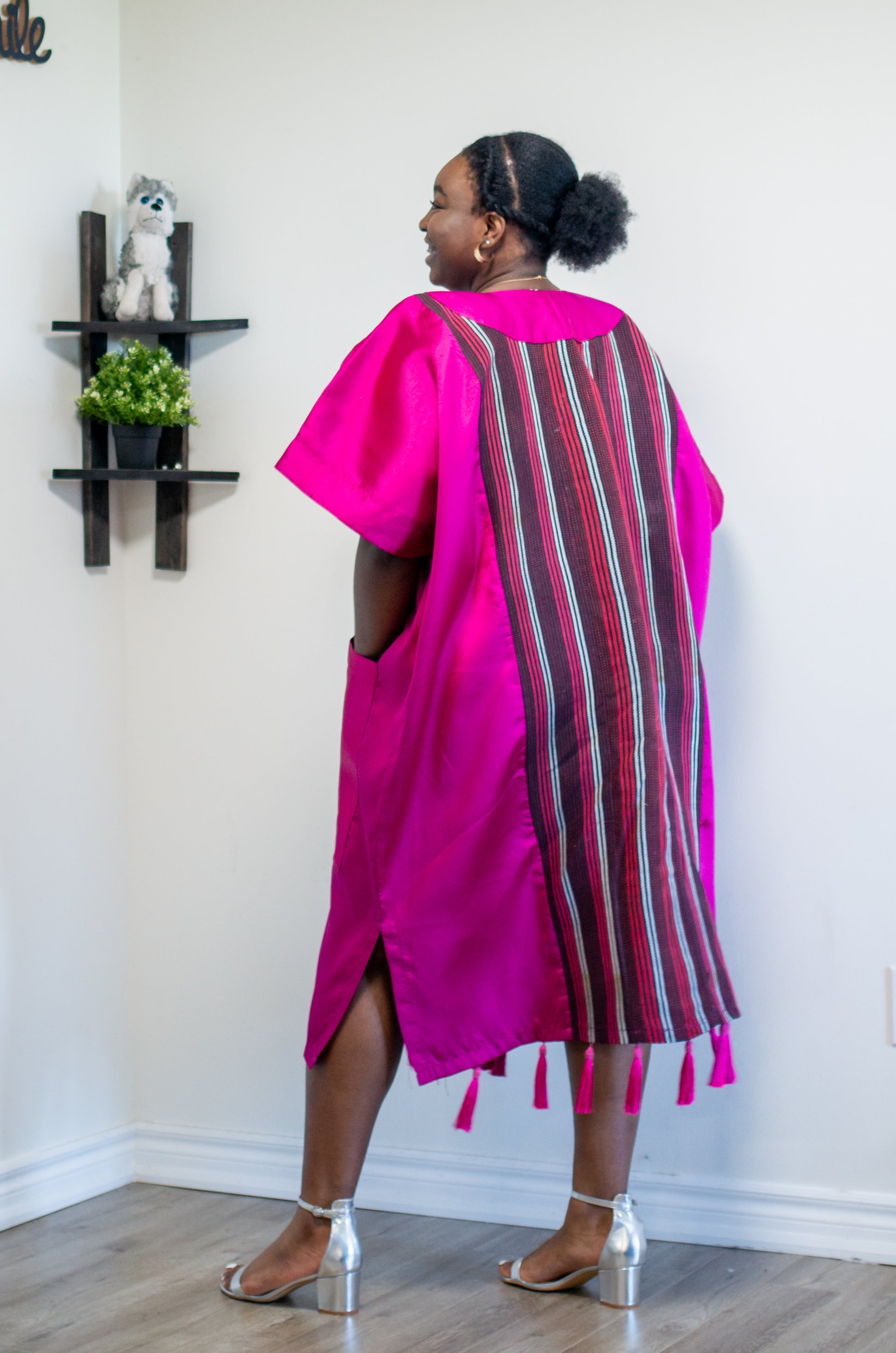 The Mira Gown is a free-size Ankara midi dress with a flowing cut and short sleeves, offering effortless elegance. A striking Aso-oke panel runs front and back, featuring two functional front pockets, and finished with playful tassels at the hem for movement and flair. Perfect for weddings, cultural gatherings, and special occasions.