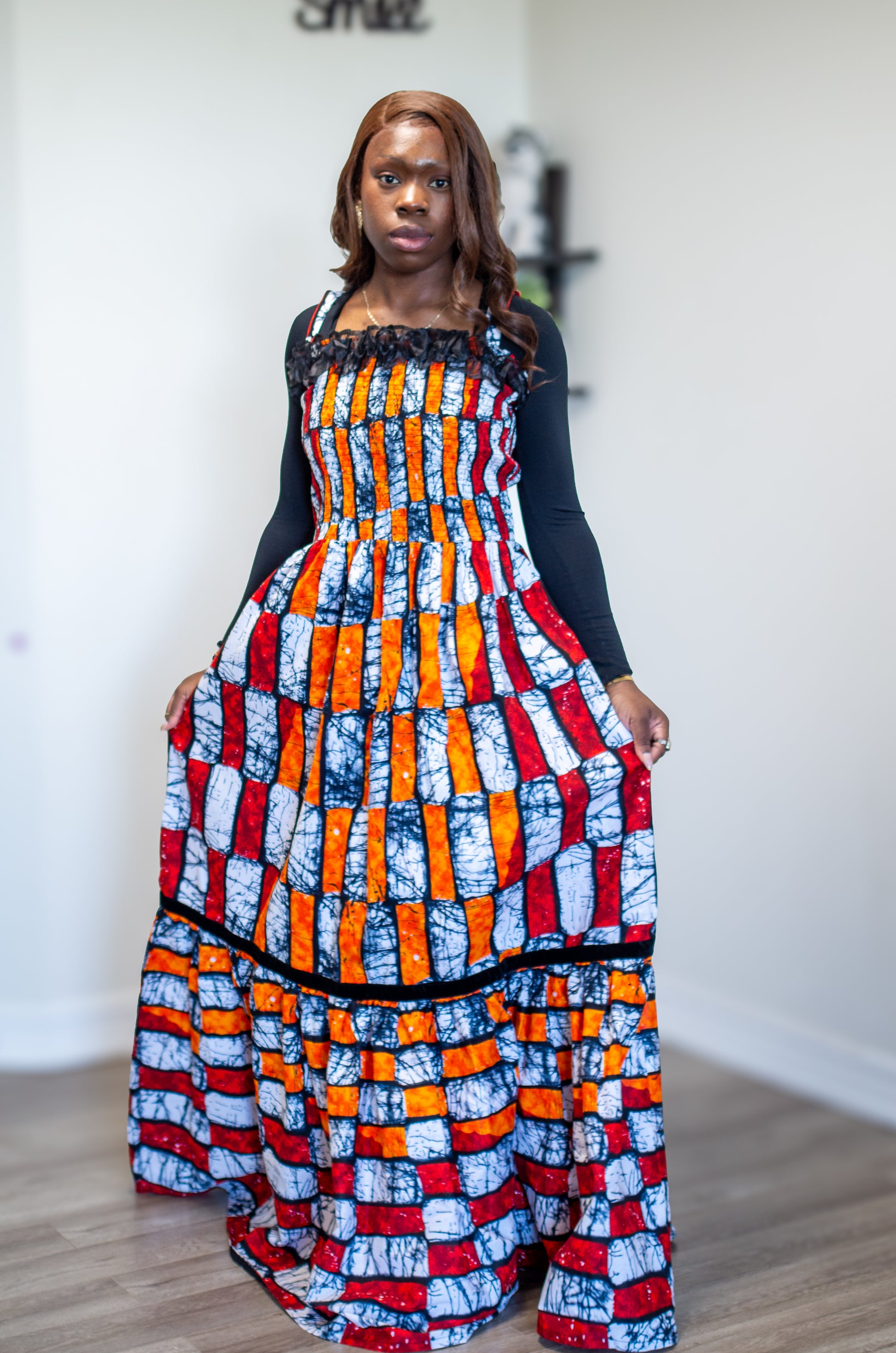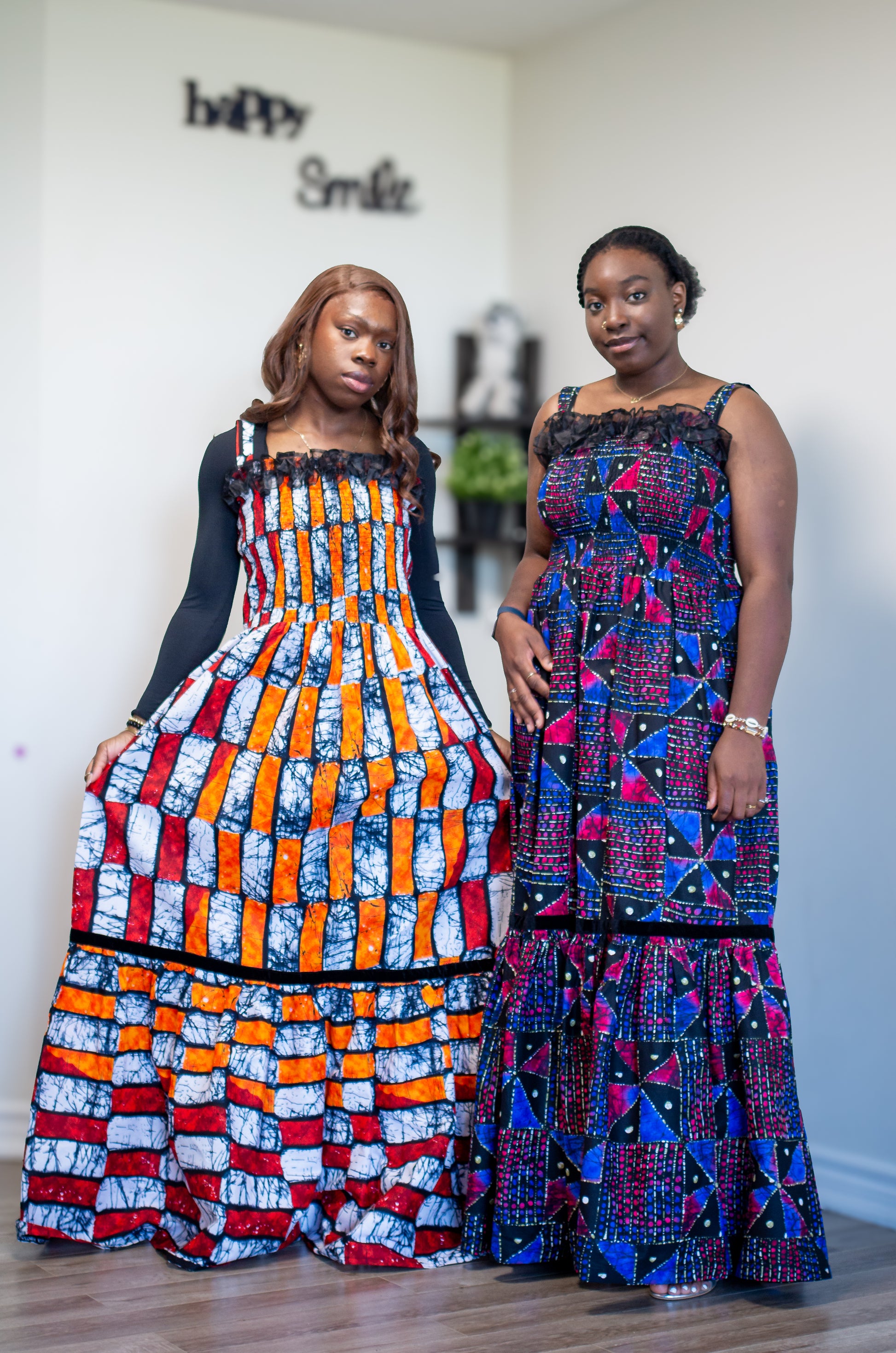 Effortless and chic, this sleeveless Ankara maxi dress is designed to flatter with its smocked bodice that offers flexible sizing and a comfortable fit. A ruffled neckline detail adds a touch of playful charm, while the flowy maxi silhouette makes it perfect for vacations, brunches, and relaxed occasions. Light, vibrant, and made to move with you.