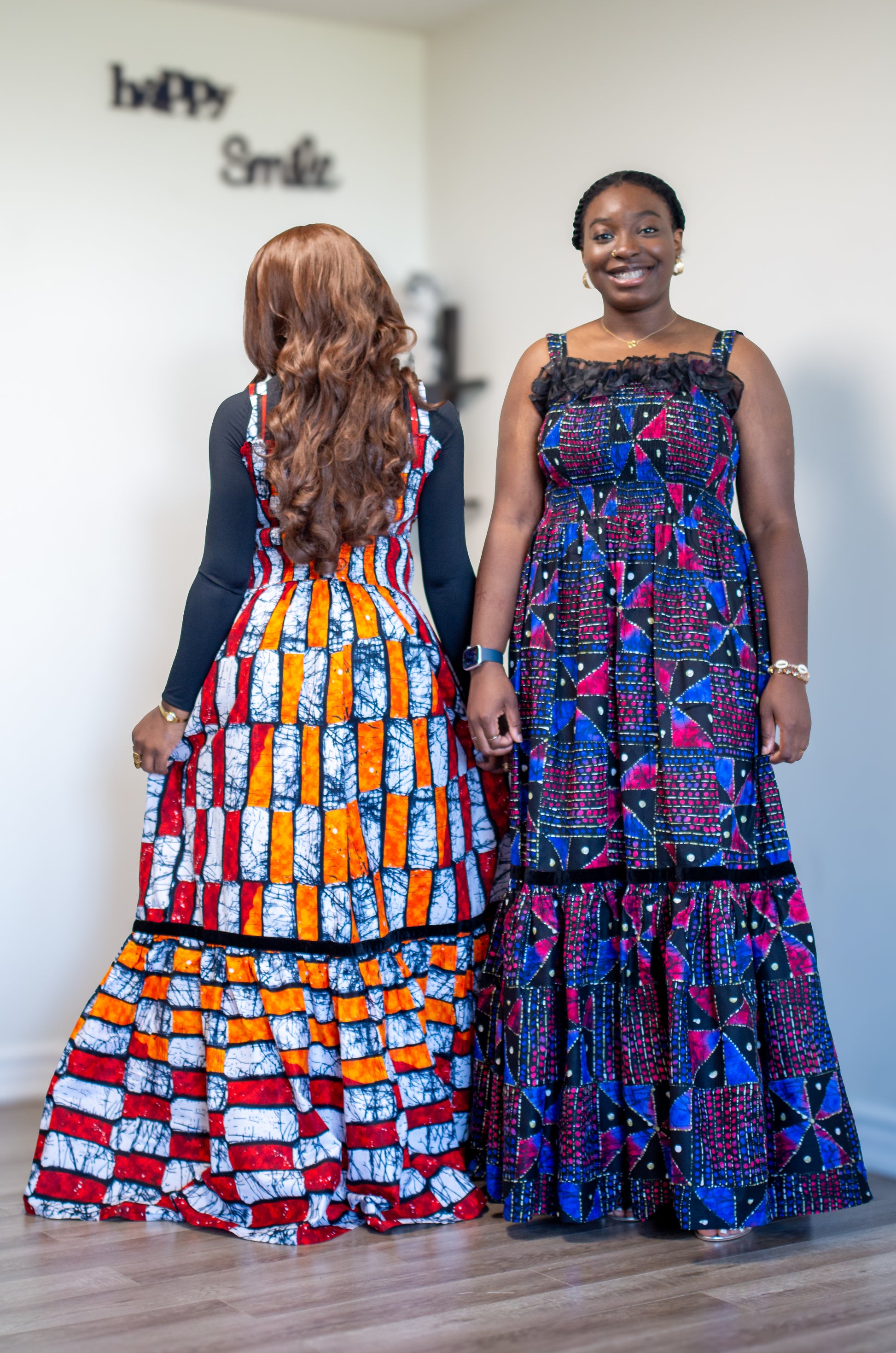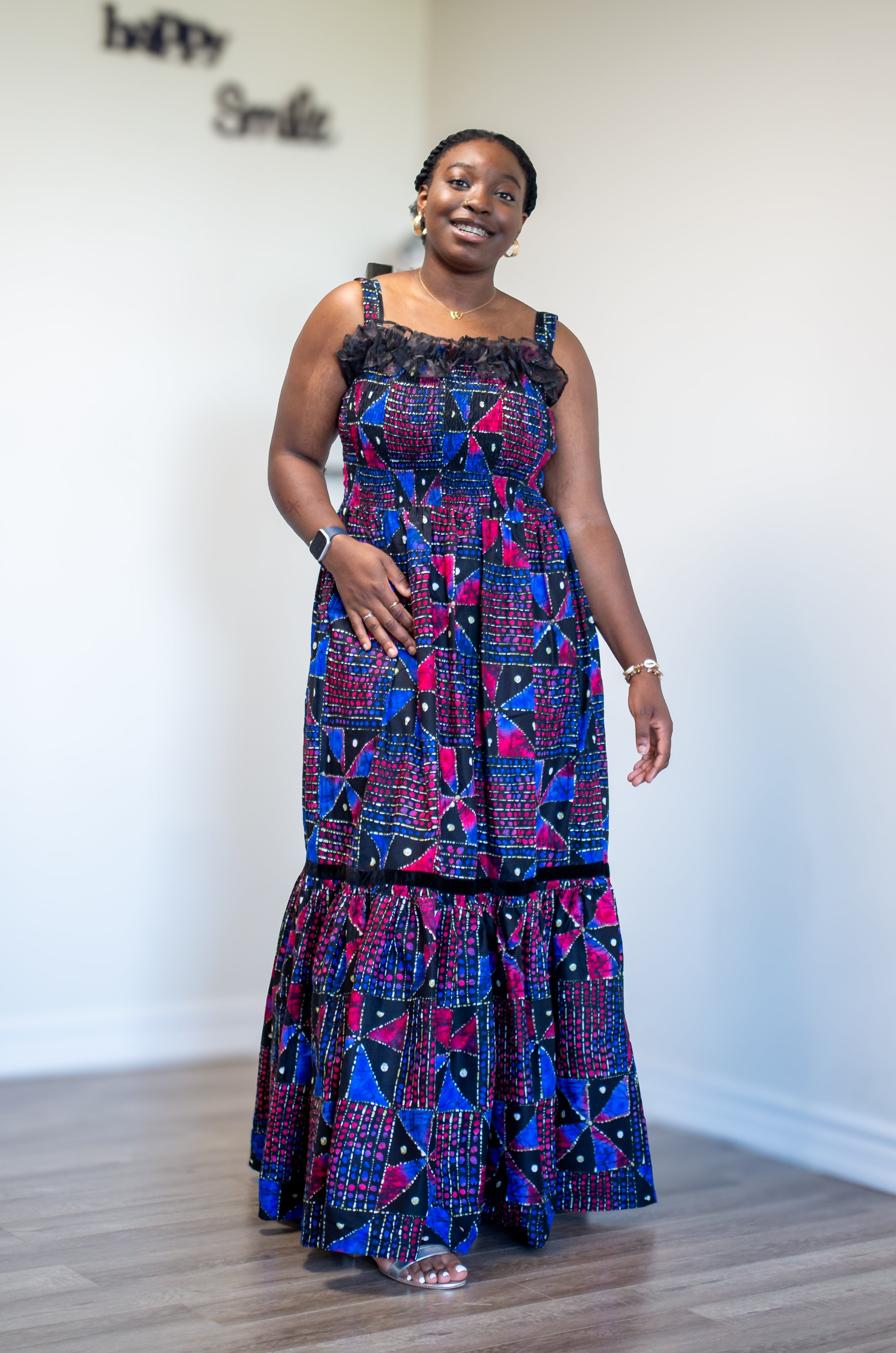 Effortless and chic, this sleeveless Ankara maxi dress is designed to flatter with its smocked bodice that offers flexible sizing and a comfortable fit. A ruffled neckline detail adds a touch of playful charm, while the flowy maxi silhouette makes it perfect for vacations, brunches, and relaxed occasions. Light, vibrant, and made to move with you.