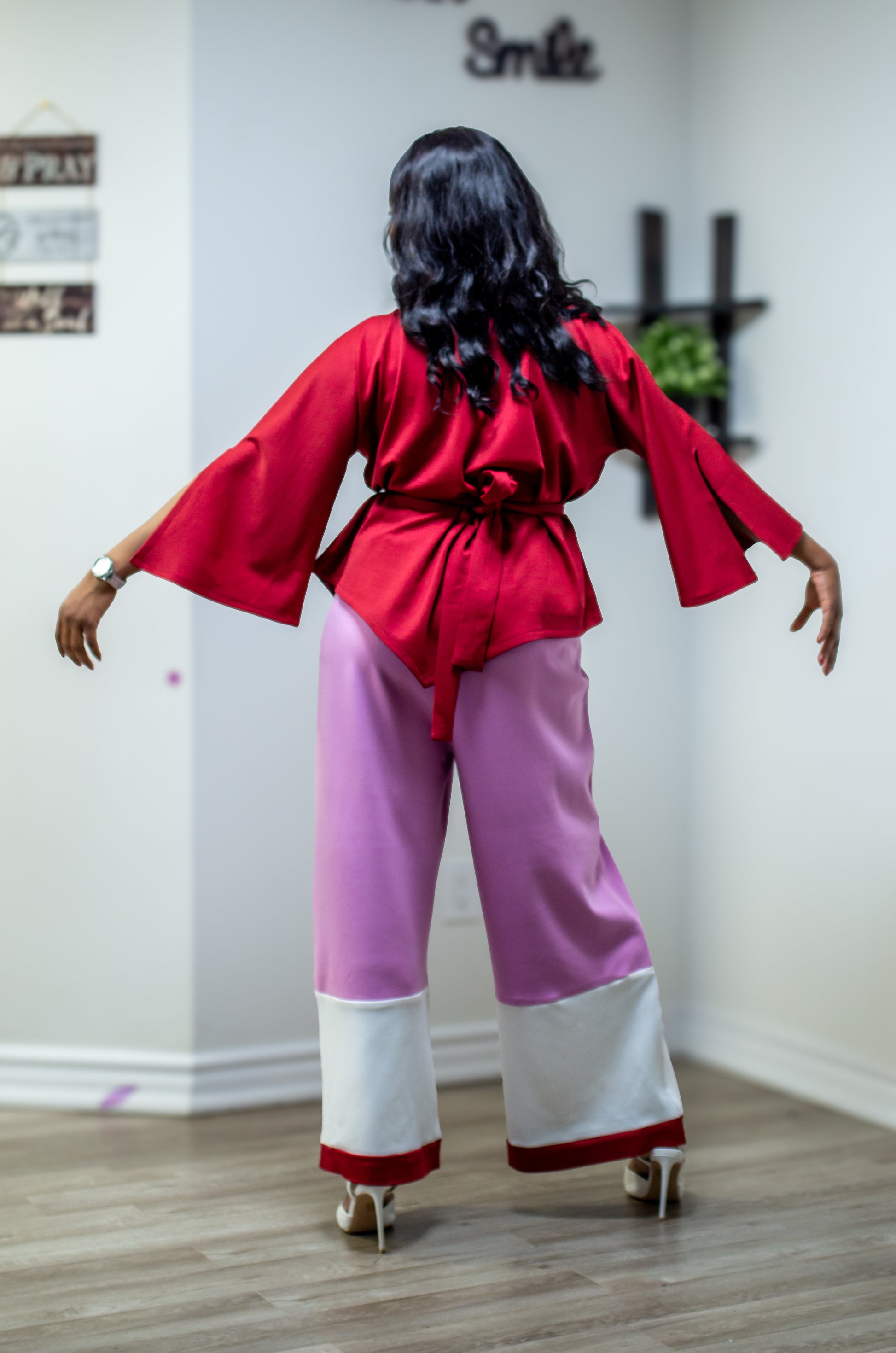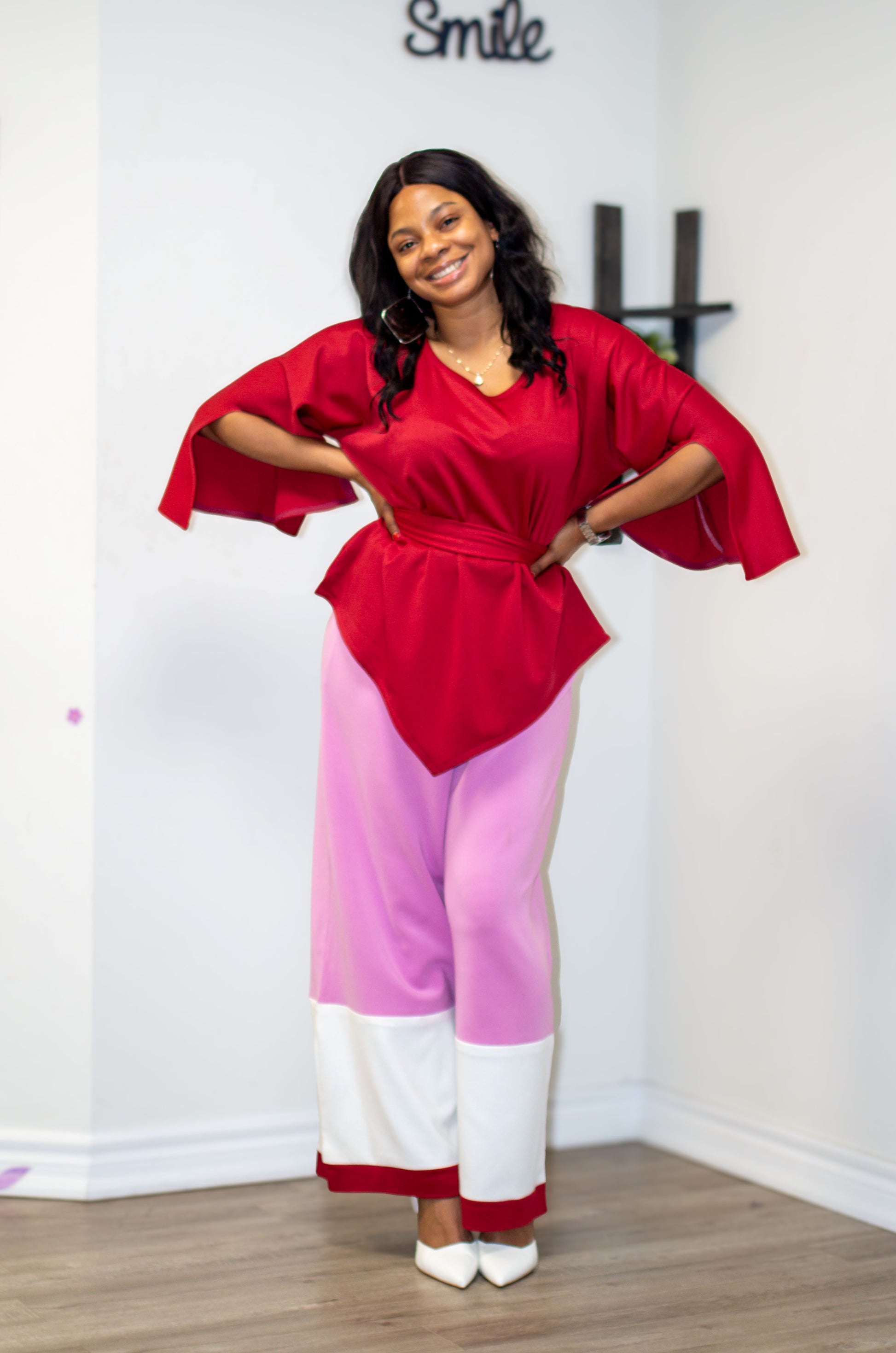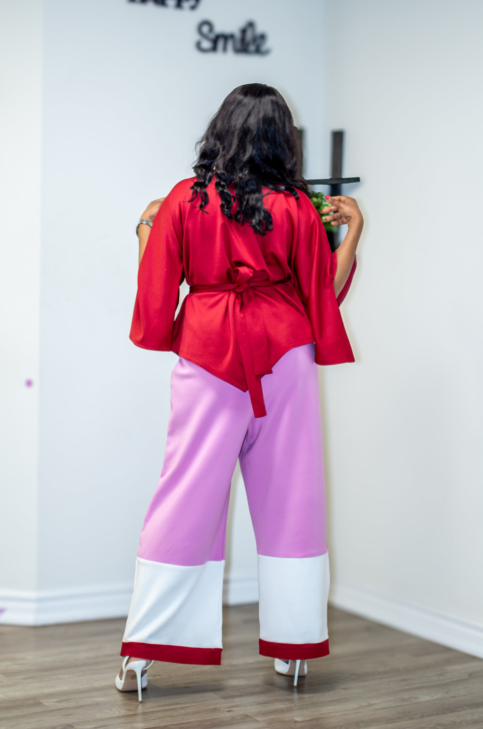 Bold color blocking meets modern tailoring in this two-piece set, designed for women who love to stand out with confidence. The top features a rich red hue with wide sleeves and a waist tie that sculpts the silhouette, while the wide-leg pants bring a playful twist in pink, finished with crisp white and red panels at the hem. Effortless yet striking, this set is perfect for parties, dinners, or days you want to dress with unapologetic flair.