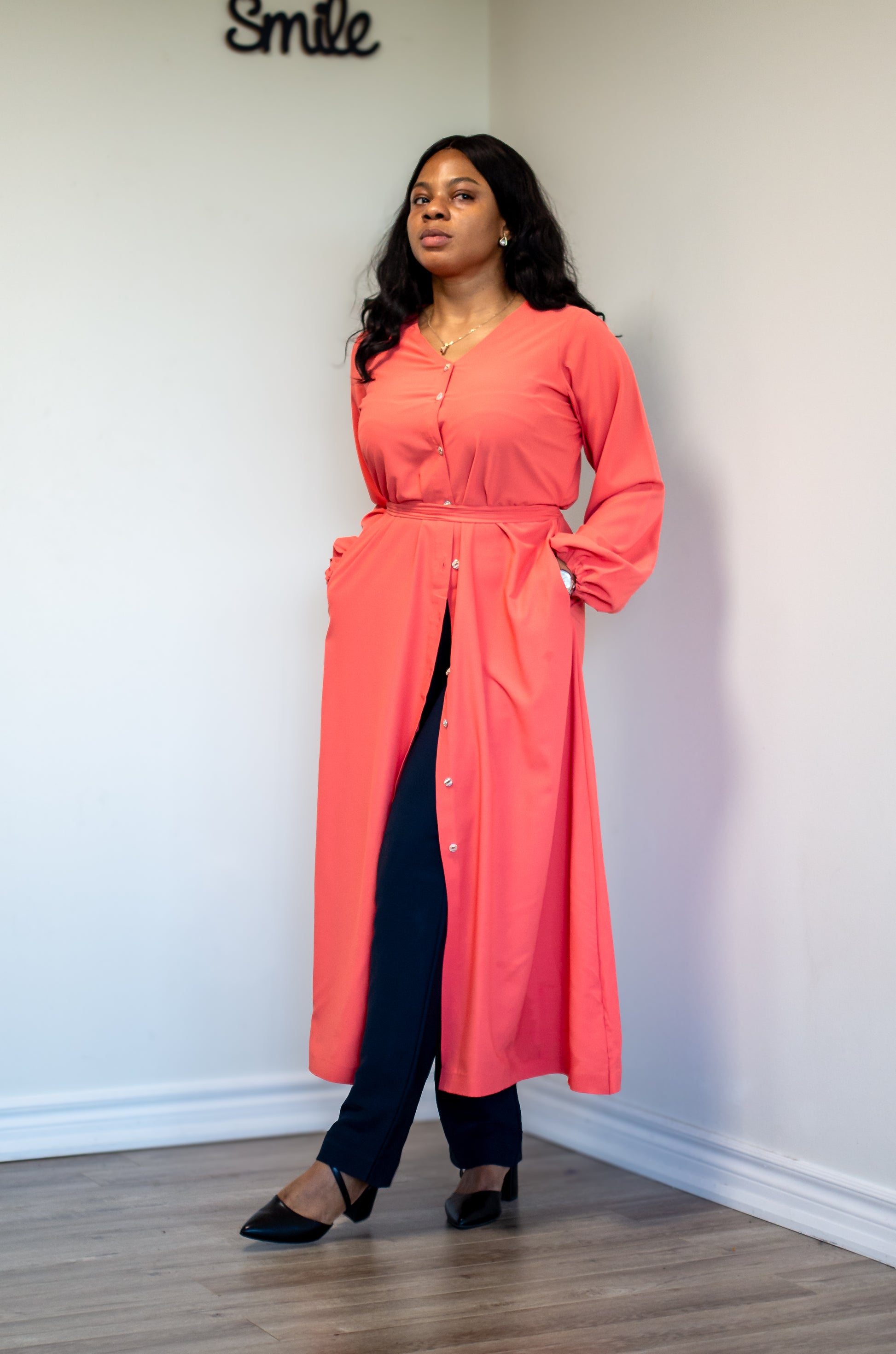 This two-piece set offers two looks in one, with endless styling options — wear the button-front shirt dress as a flowy gown or layer it with the matching pants for a polished co-ord look. With adjustable waist ties, cuffed sleeves, and side pockets, this set seamlessly blends ease with everyday elegance, making it perfect for brunch, travel, or evening gatherings.